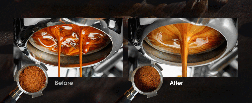 Water rushes through the easiest paths. It over-extracts some areas (bitter flavors) while under-extracting dense parts (sour flavors). You get one shot that’s sour, bitter, and weak all at once.